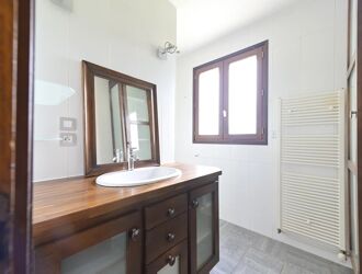 A l'étage, vous trouverez une chambre spacieuse et lumineuse, une salle de bain avec une vasque et une baignoire, et un toilette séparé.