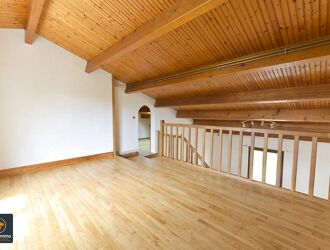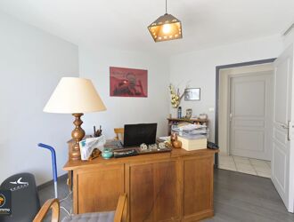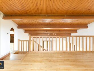 A l'étage, une grande pièce en mezzanine avec un balcon et un bureau mansardé d'environ 12m² au sol.